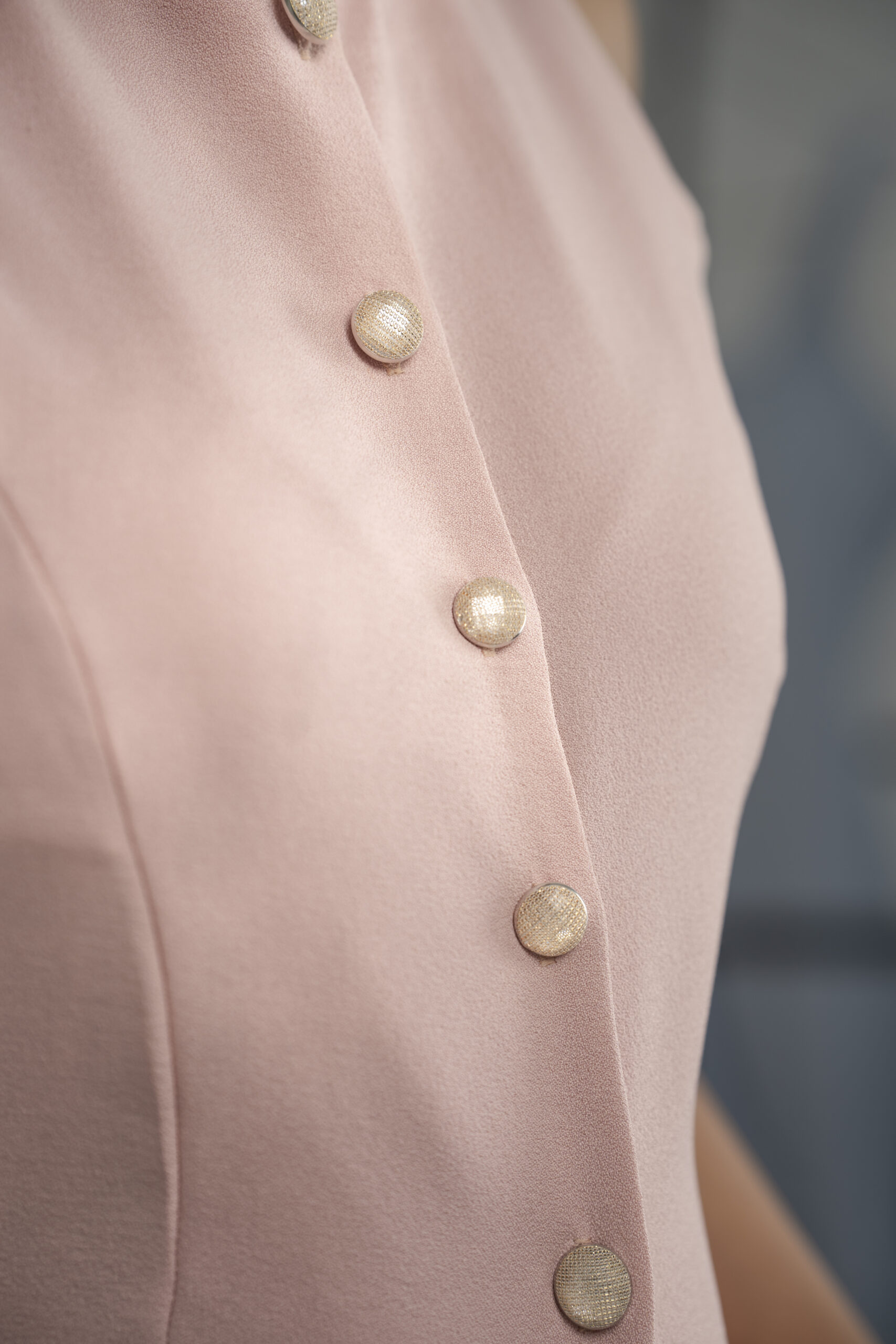 A stylish blush pink two-piece outfit featuring a sleeveless button-detail top paired with a sleek maxi skirt. Designed for a sophisticated and feminine look, perfect for formal events, parties, or elegant occasions.